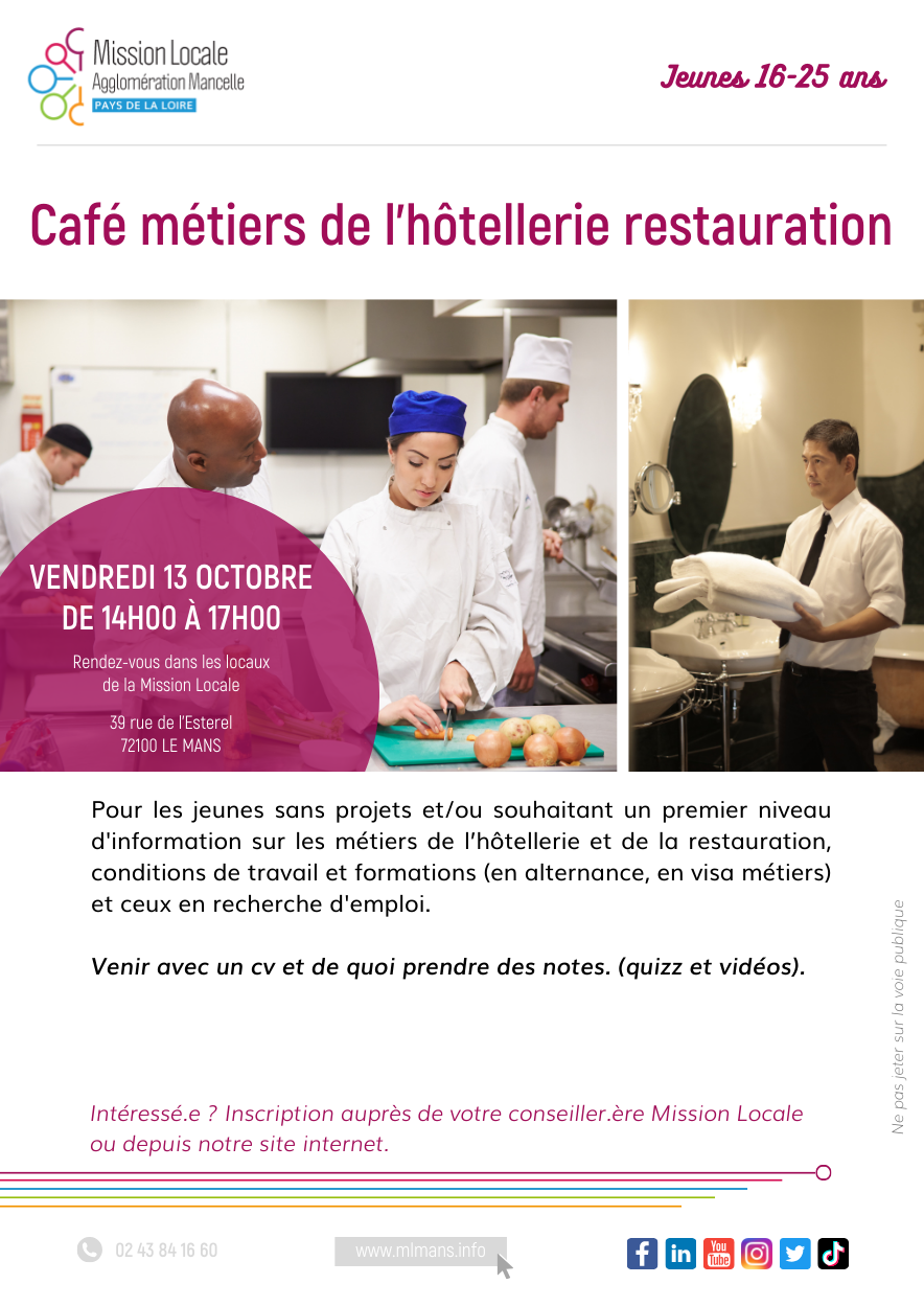 Atelier animé par la référente emploi de l'hôtellerie/restauration, à destination des jeunes sans projet et/ou souhaitant un premier niveau d'information sur les métiers de l’hôtellerie et de la restauration, des conditions de travail et des formations (en alternance, en visa métiers) et ceux en recherche d'emploi.